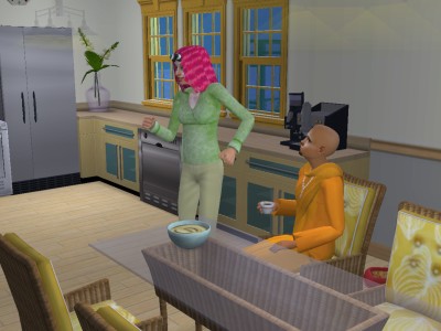 "Honey? Is that really how you mix the pancakes? By spinning around and sticking your stomach out?"