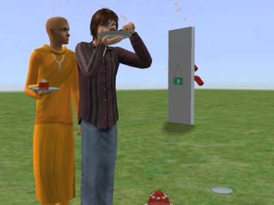 After several hours of hard work, Lobsang stops to eat some delicious gelatin himself, and who should wander by to share his meal but Twain. Again.