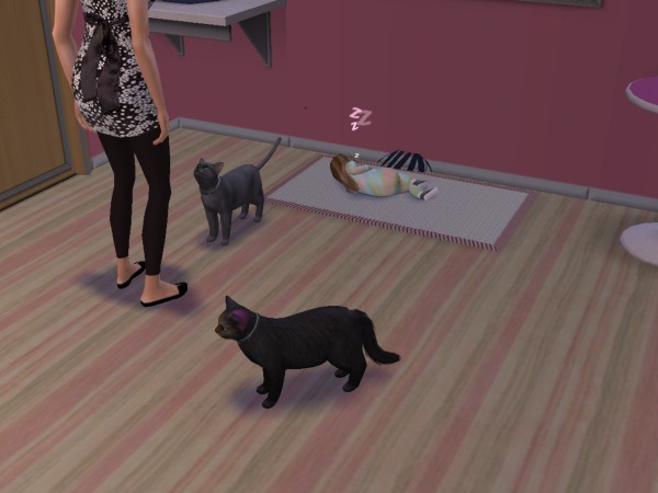 The cats try to convey their suspicions to Kofi. "What? The baby didn't eat your food. Your bowl is perfectly full."